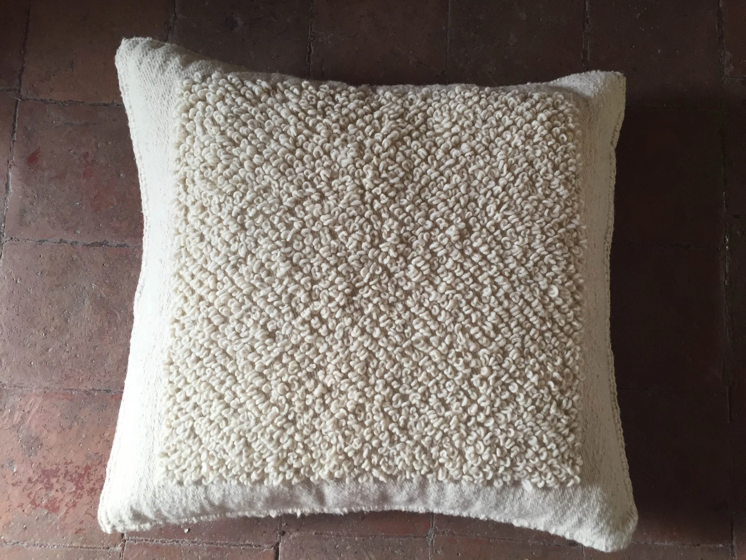 This small textured loop weave was created to be used in the interior lining for a traditional vest worn by men in the town. Replicating the cosiness of a shearling coat. The town of Gualupita is a high altitude mountainous town located in central Mexico. We made rugs and x-large floor pillows with this weave also recreating the vest using Merino wool.