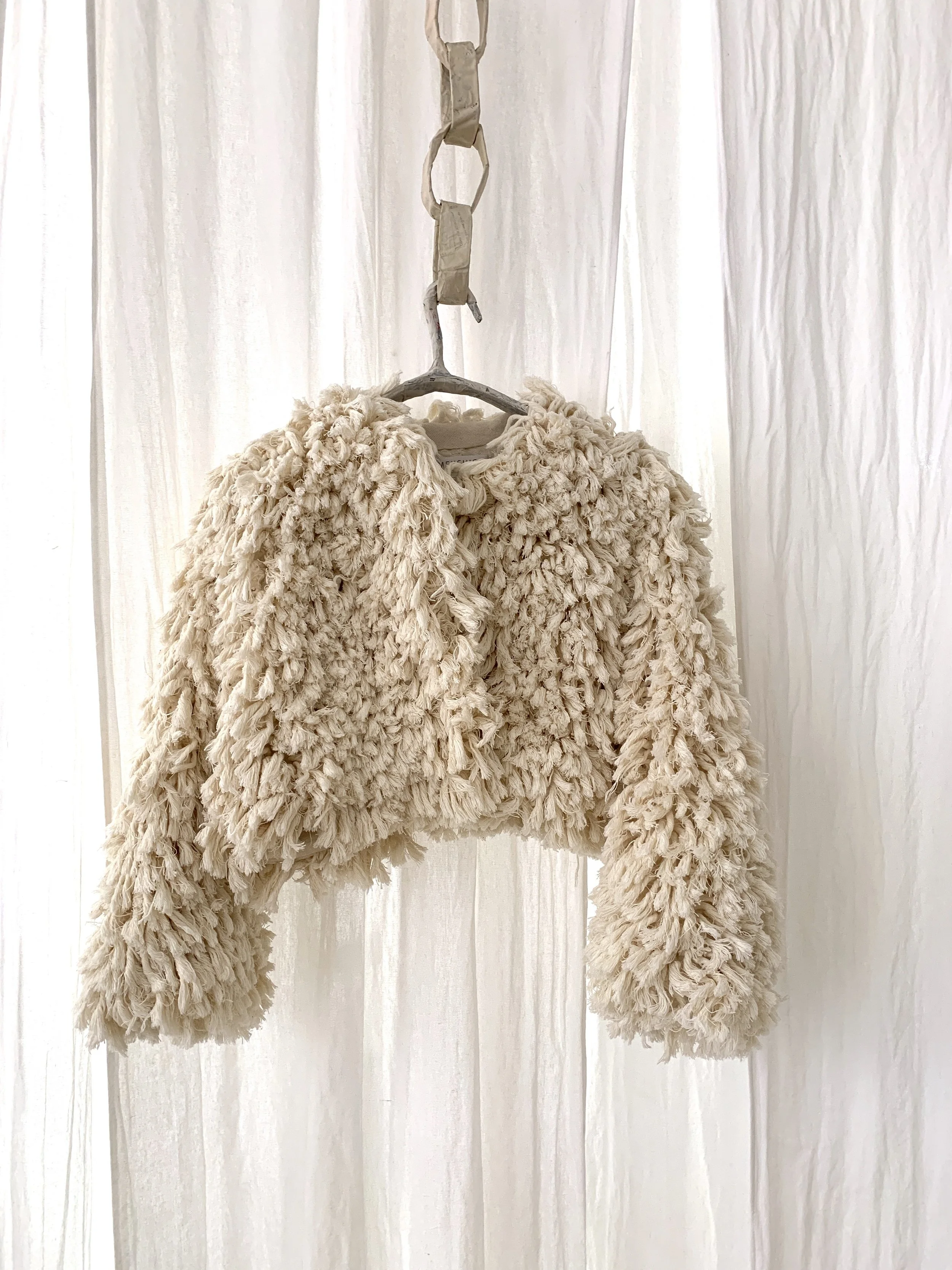The Izzy Shag Collection, is handwoven in cream colored natural un bleached cotton, created in collaboration with artisans in central Oaxaca. We developed this gorgeous and playful shag texture with artisans in central Oaxaca, with the idea of expanding it into homewares, clothing and accessories (as we love to do!). The shag texture in Mexico was a popular look made into handwoven rugs in the 1960’s though typically made with wool, I imagined a cotton variation would be a more practical and useful material, being that it would be available year round and would not have the itchiness associated with wool. We have Izzy Shag Throw Pillows and Izzy Shag Crop Jacket available for purchase in our shop. If you’d like a quote on a specific bespoke item such as our Serpent Sculpture, feel free to send us an email to hola@mexchic.co