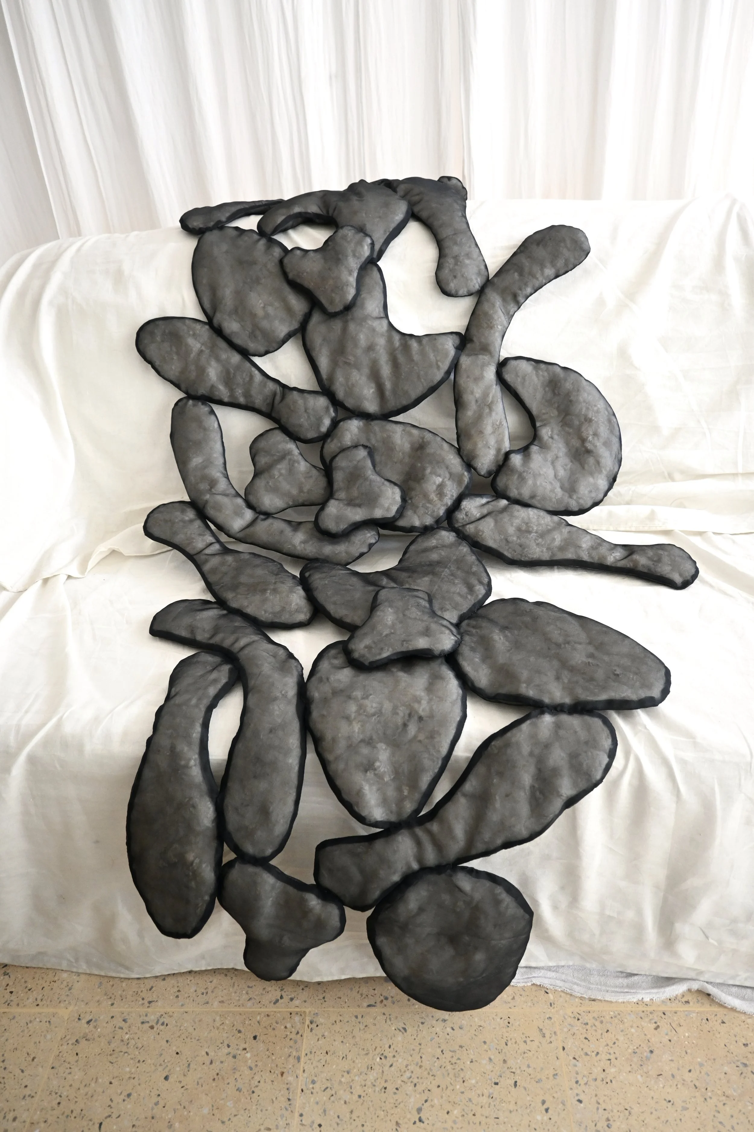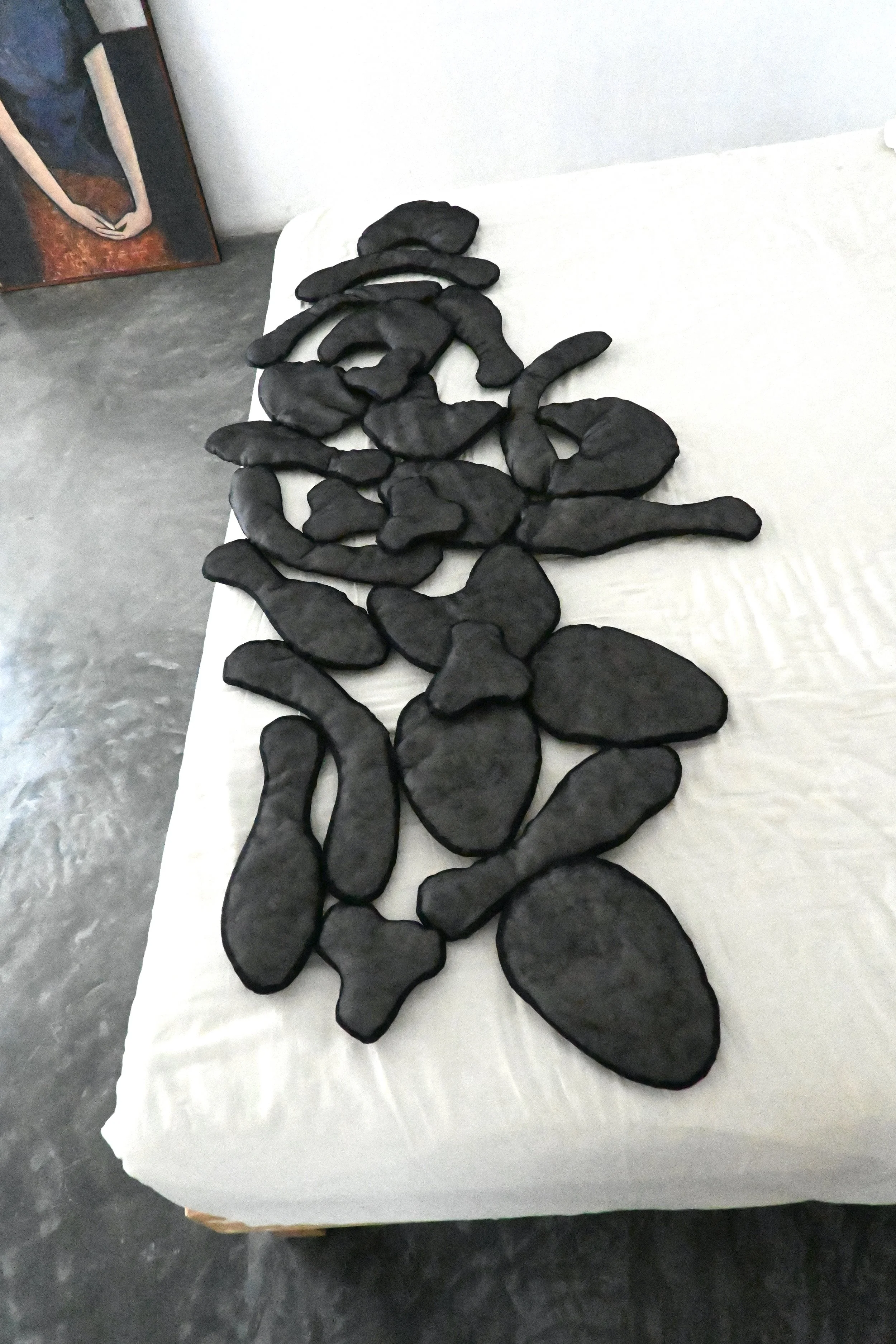 Black vintage silk organza textile, hand cut and hand sewn, stuffed with pochote fiber procured in Oaxaca, Mexico. There are five shapes, joined together by hand.