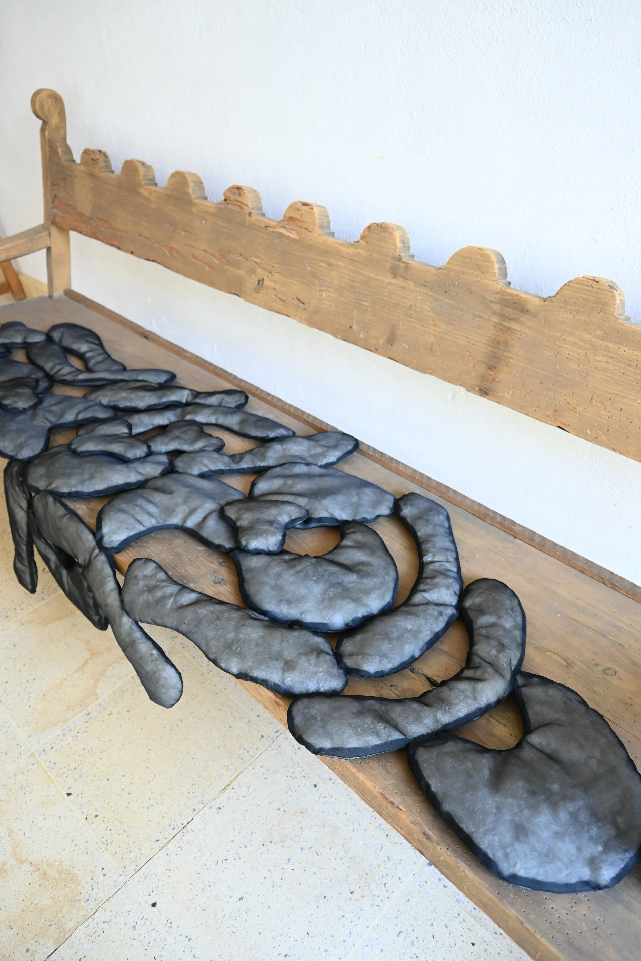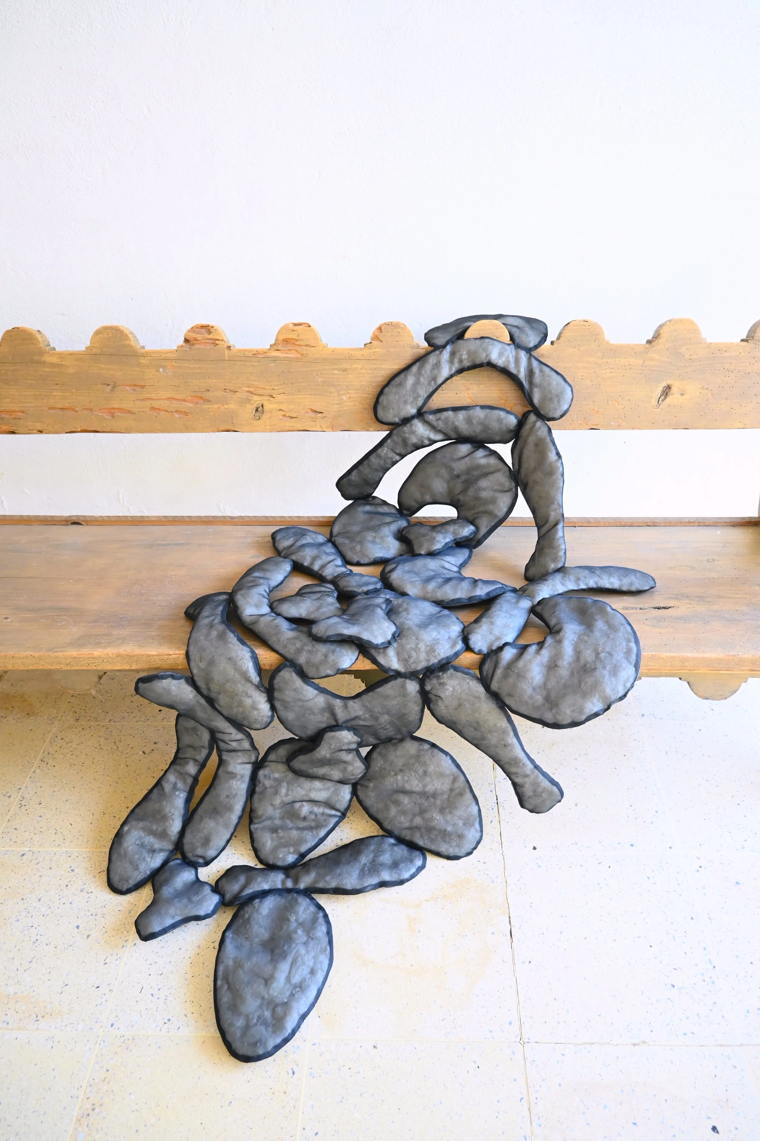 A one-of-a-kind soft sculpture, can be laid on a chair or bed, or hung.