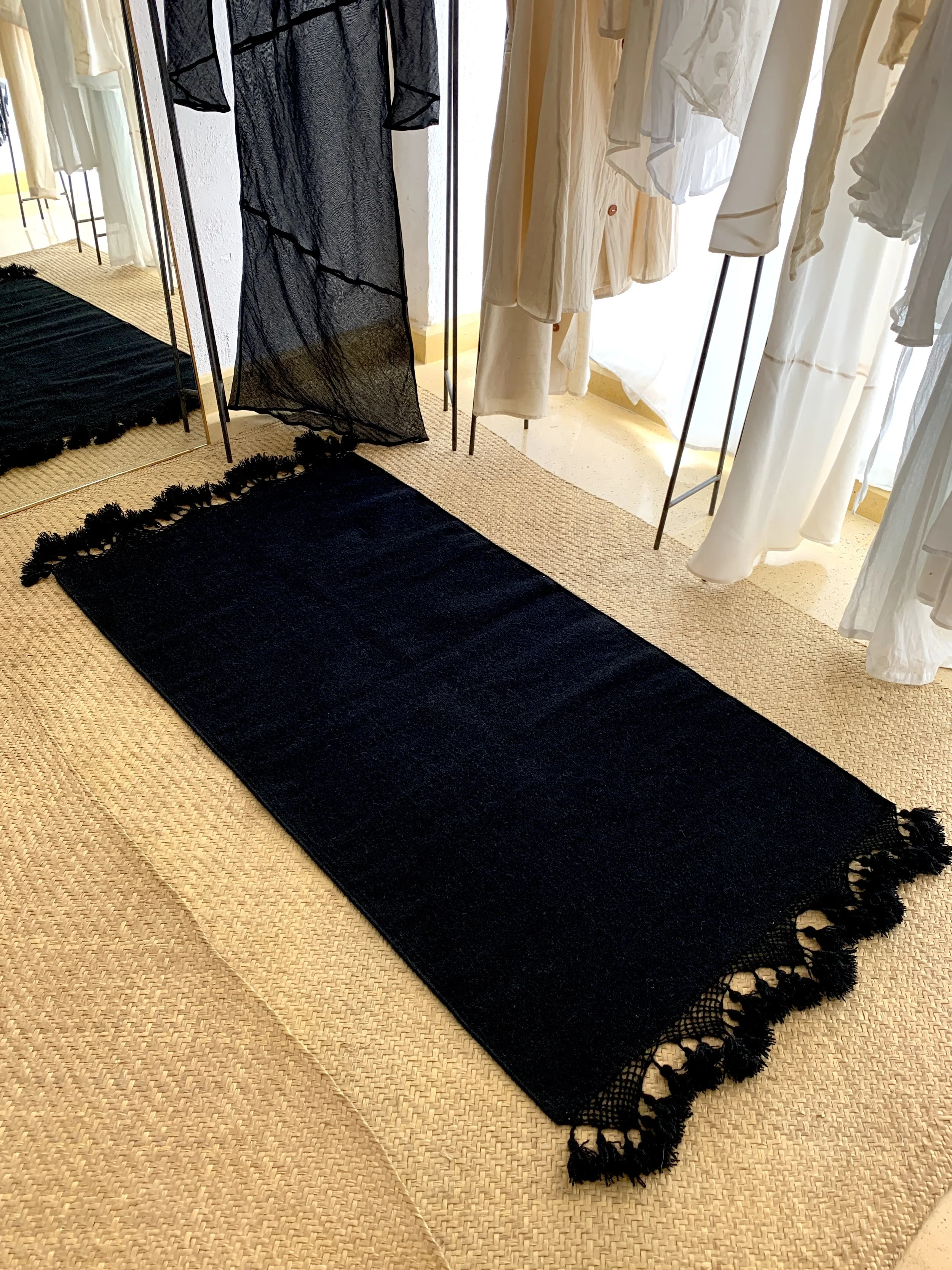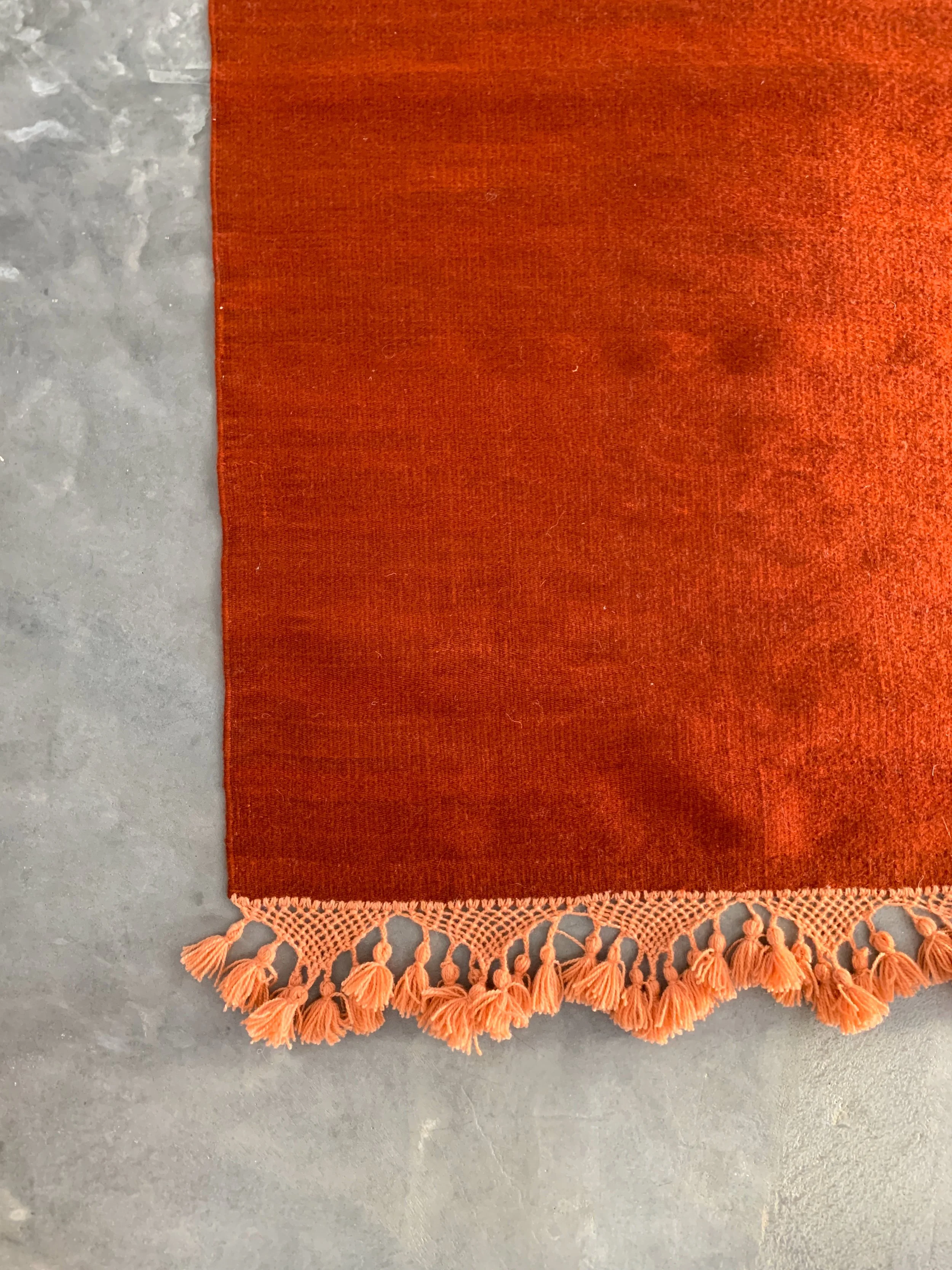 We developed a very specific color palate of natural dyes for a range of subtle solid color rugs. Incorporating a traditional hand knotted fringe which is traditionally used on on “fajas” (belts) by Zapotec women in the region where these rugs are handwoven, Teotitlan del Valle, gives the rugs a feminine delicacy to balance the strength of the solid color rug.