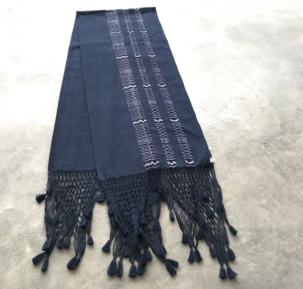 Hand woven in exquisitely thin cotton, with a special type of loom, set with fine agave fibers to receive hand resist dyed ikat yarns, which allows the loom to weave an unusually thin type of yarn, not typical of large colonial type looms in Mexico.