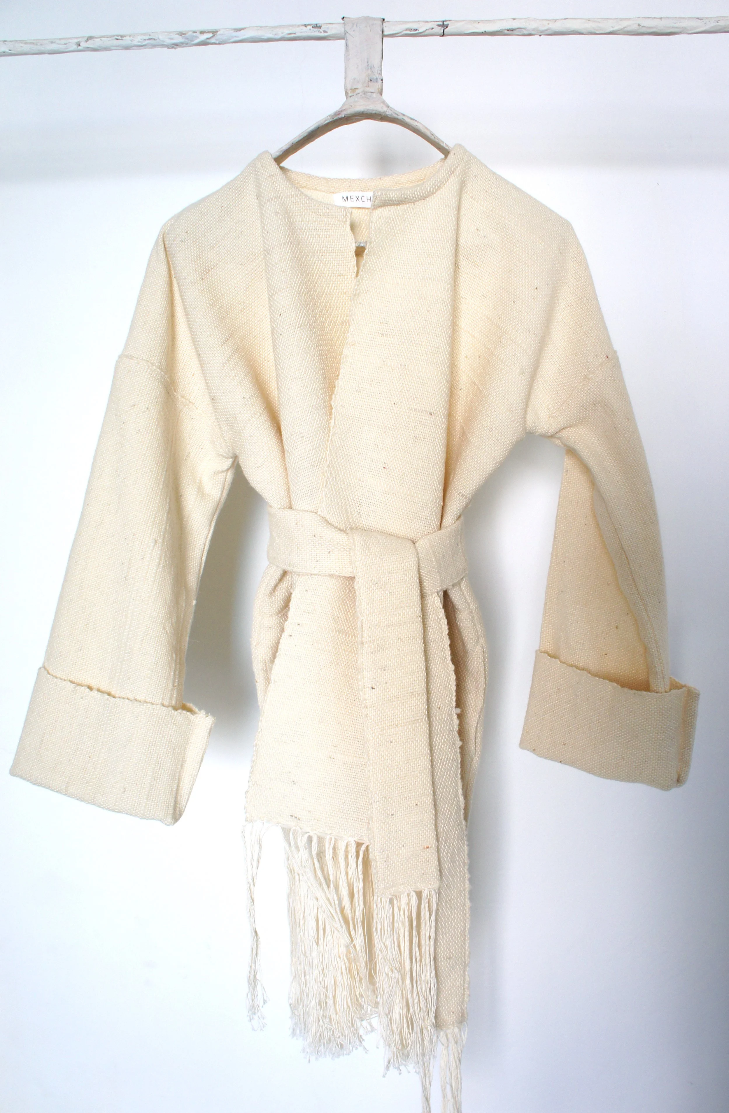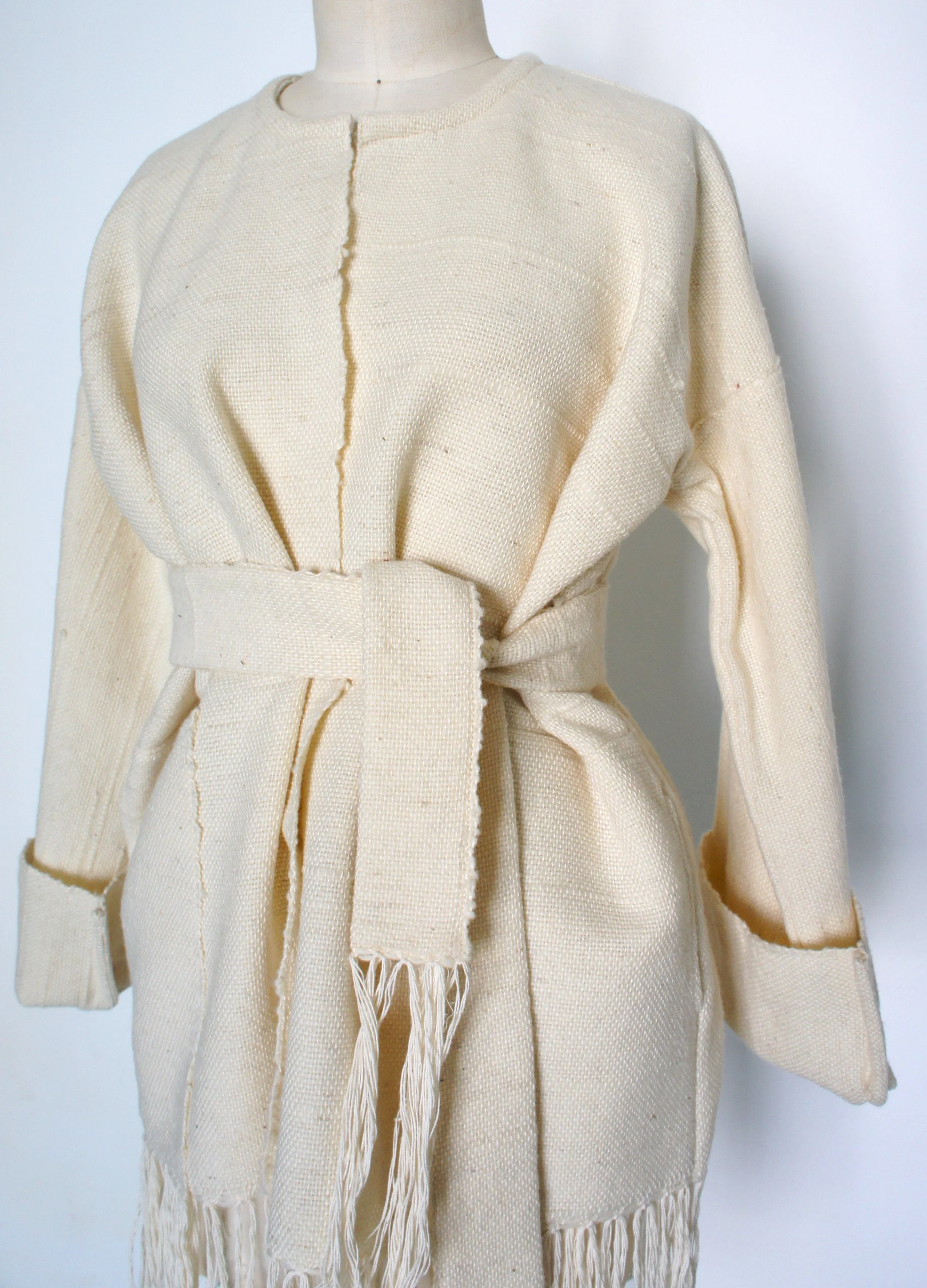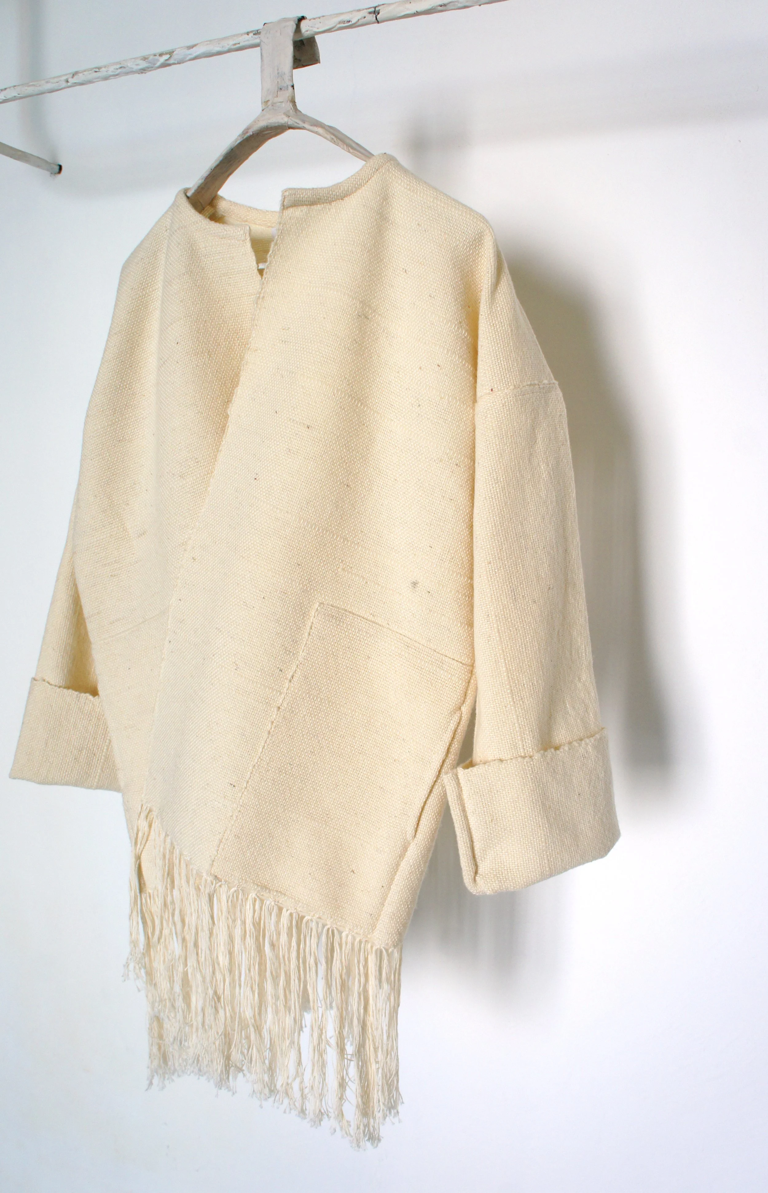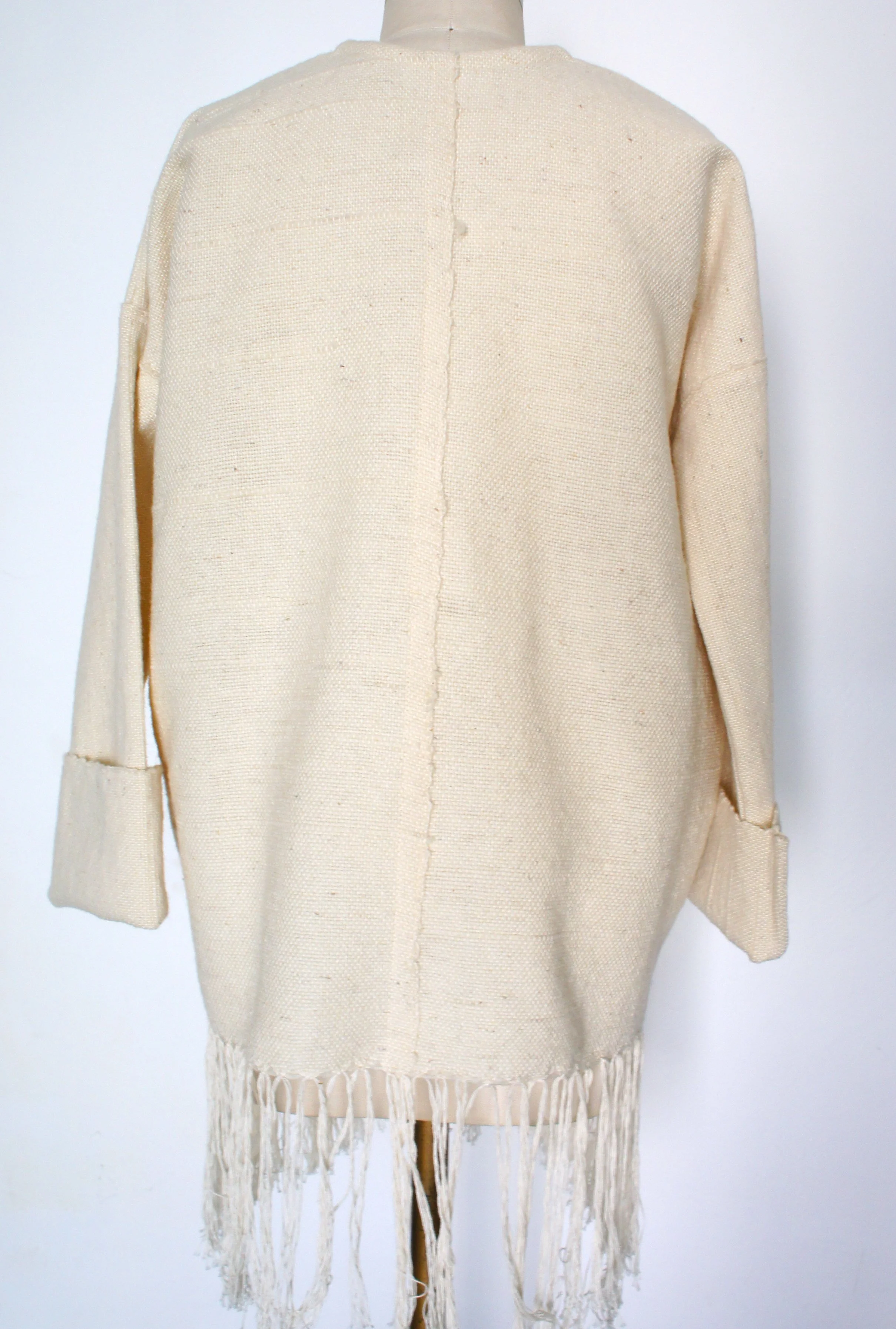 Lightweight jacket with fringe, created in collaboration with Mexican textile artist / weaver Jimena Rangel. Handwoven on a Saori loom, in her studio located in Central Mexico, with a lovely soft and plush rustic wool procured from local sheep herders and cotton mix. Limited edition of 5 pieces. Three are in a natural cream color and two are dyed with botanical dyes in the Mexchic Studio (coming soon!).