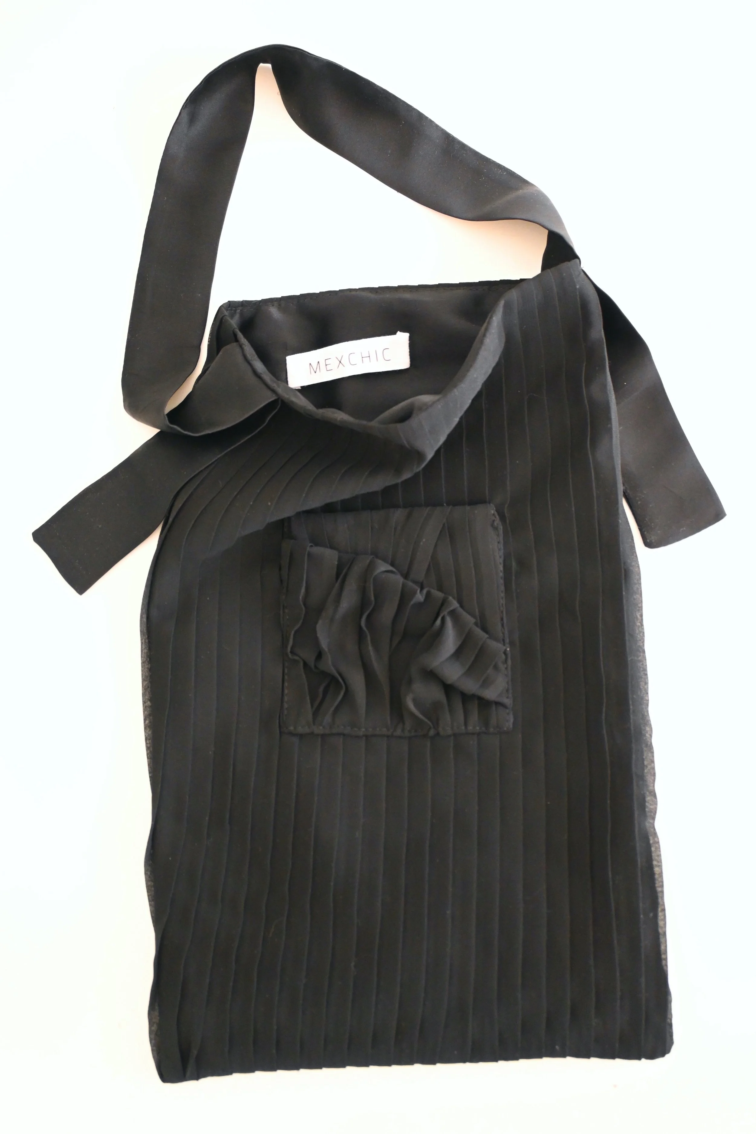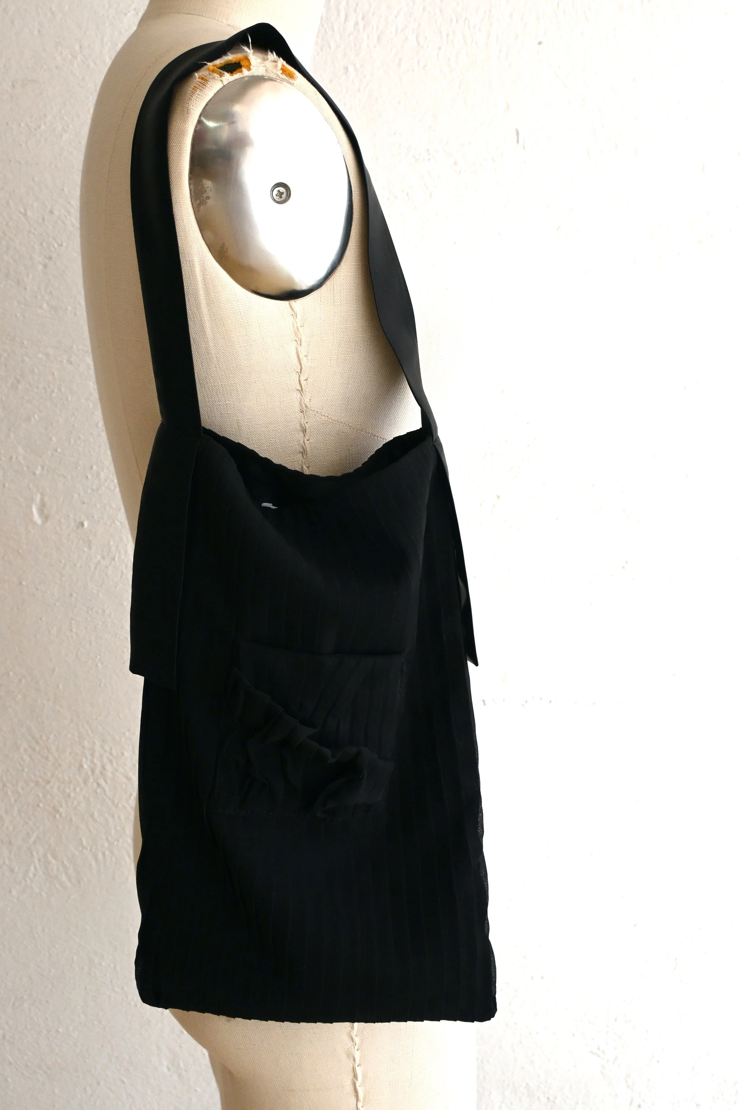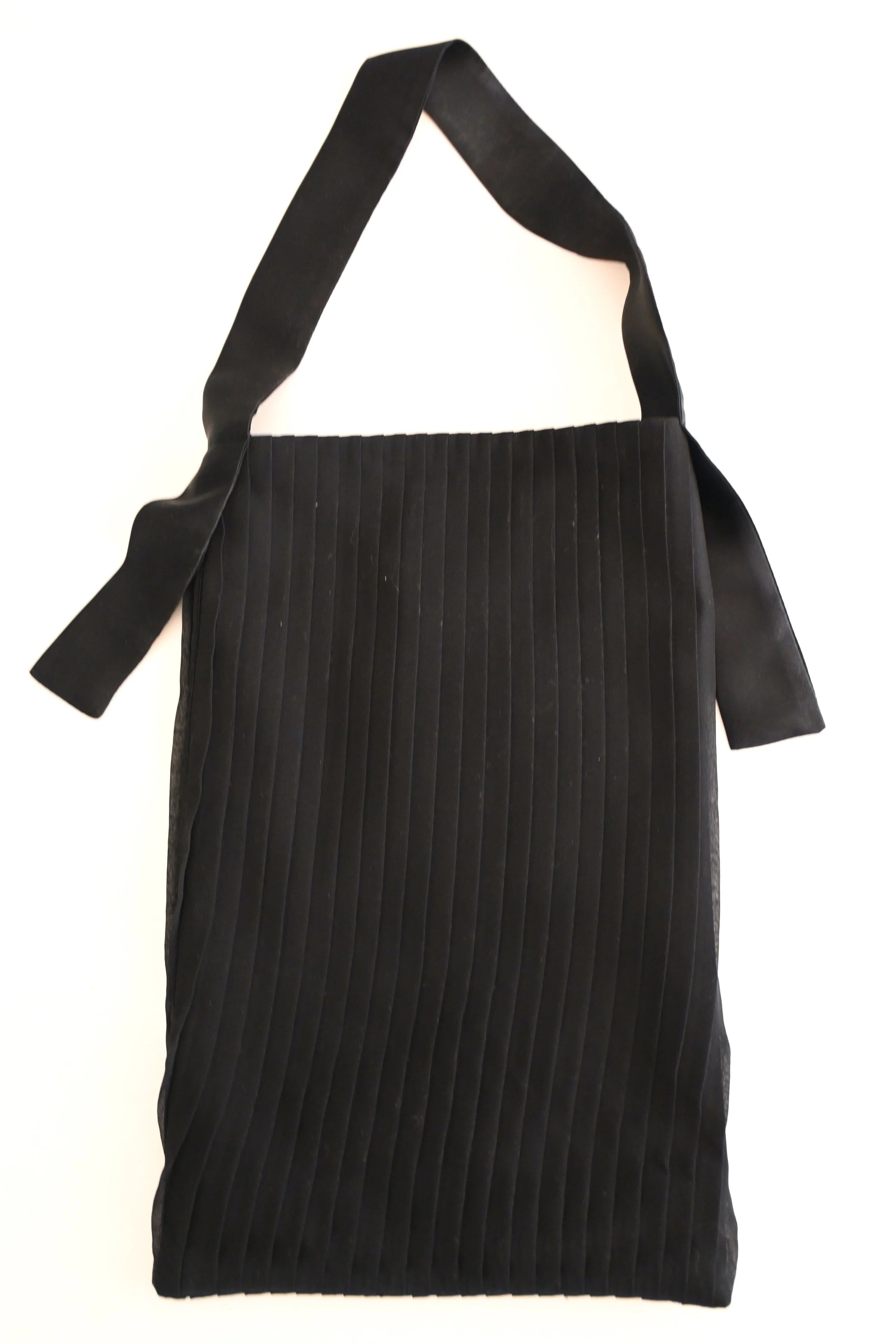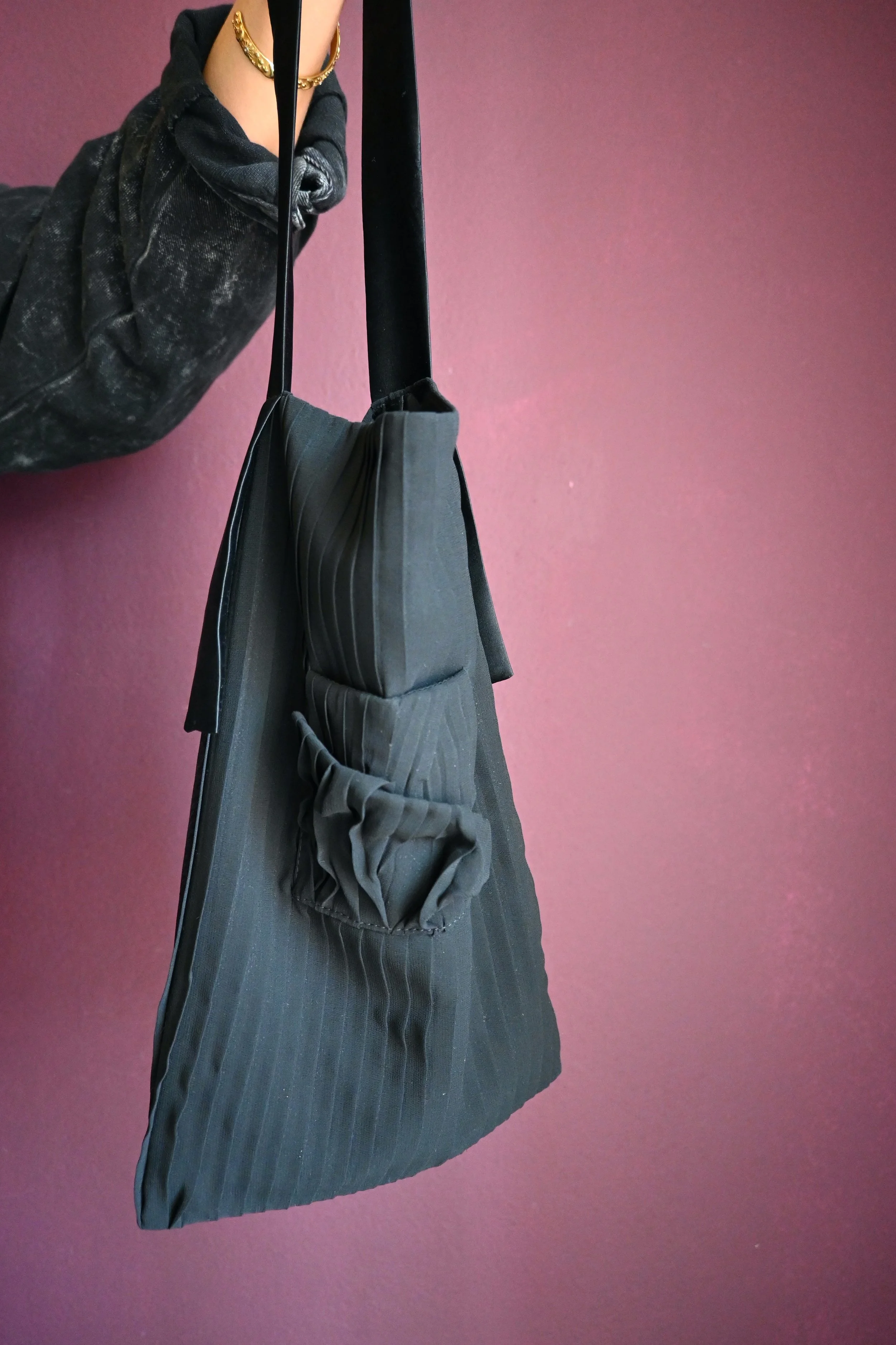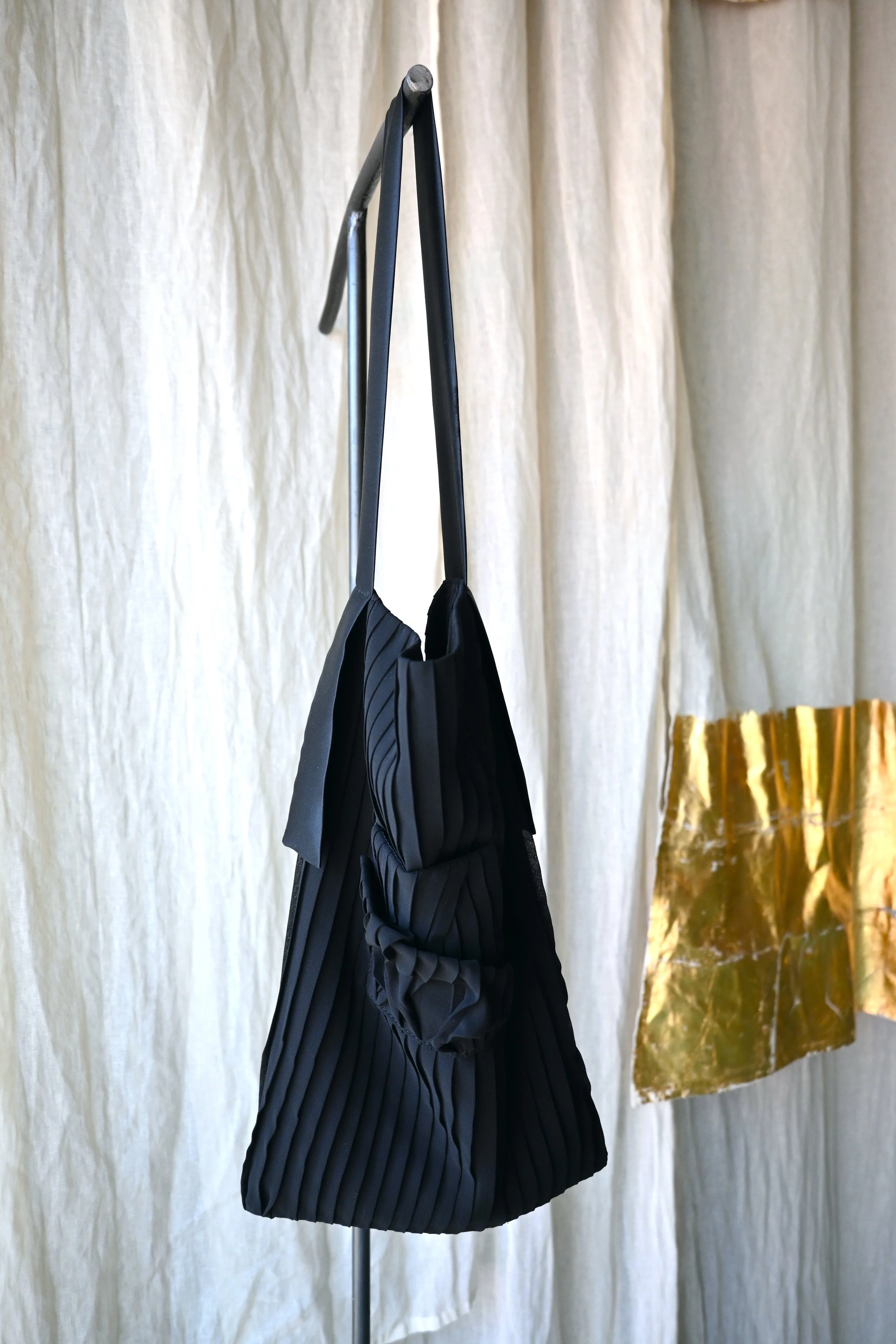 Large tote bag made with vintage Italian pleated viscose textile, which I formed into flowing sculptural shapes on the exterior front. Lined with antique handwoven textured silk from Hong Kong.