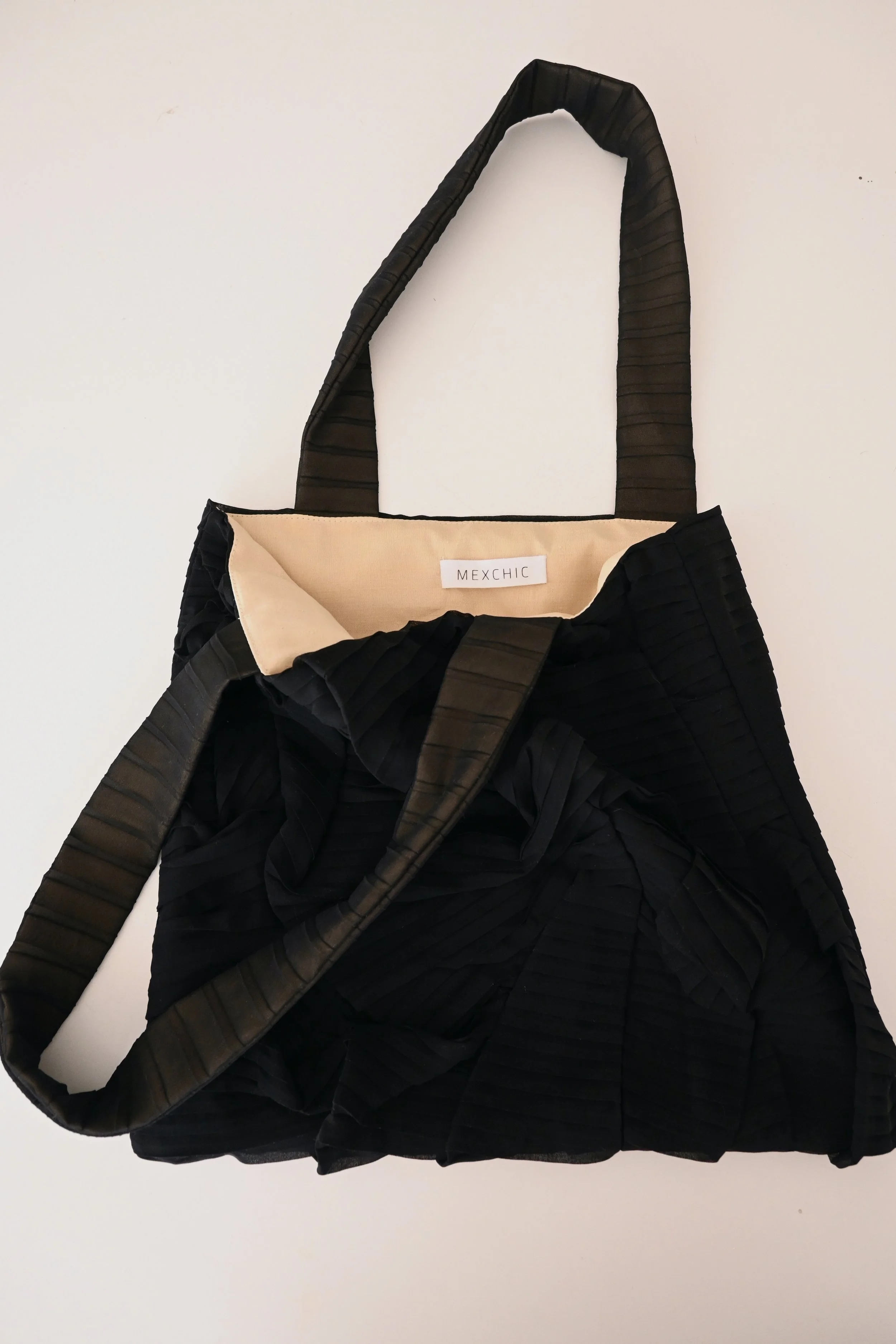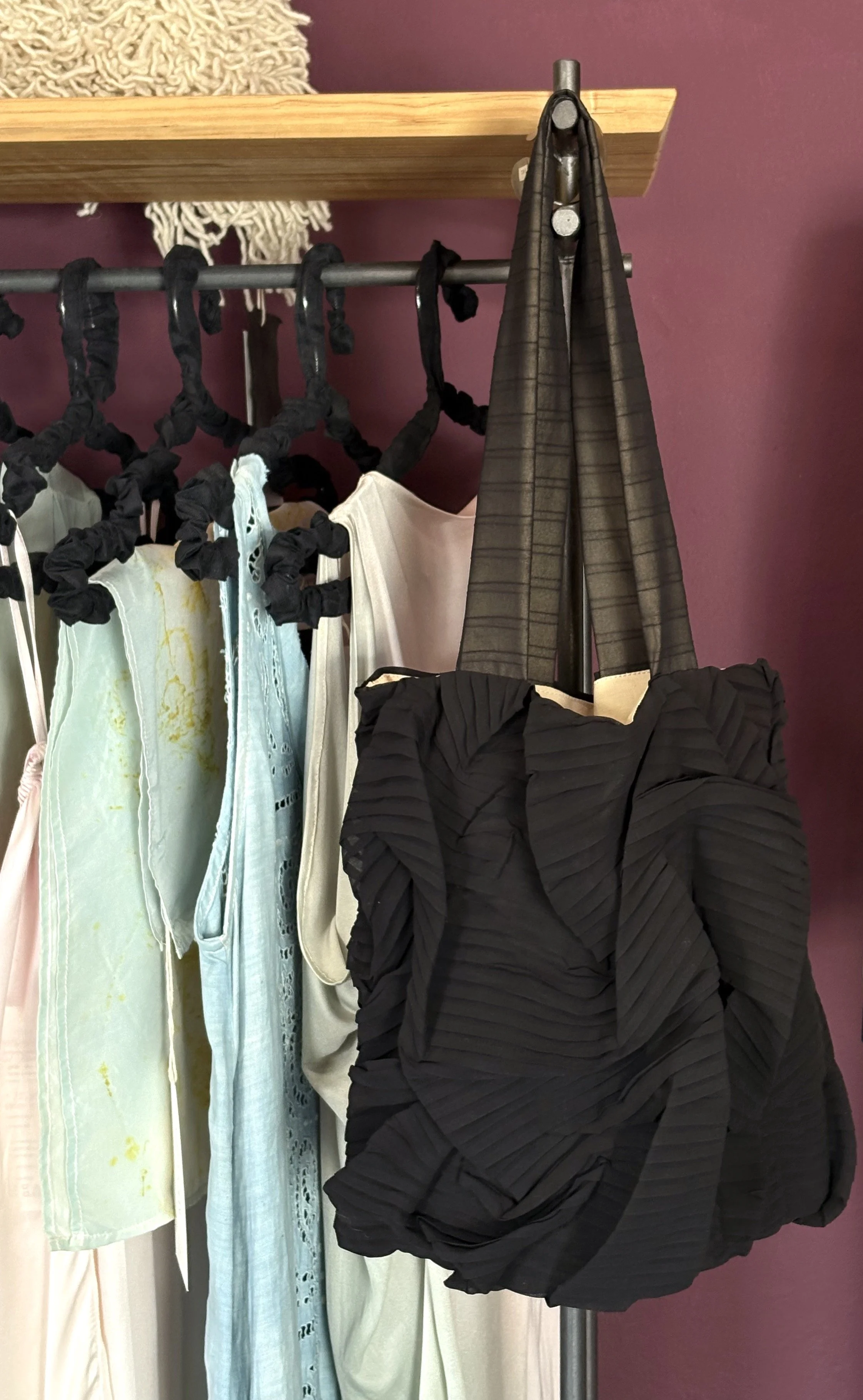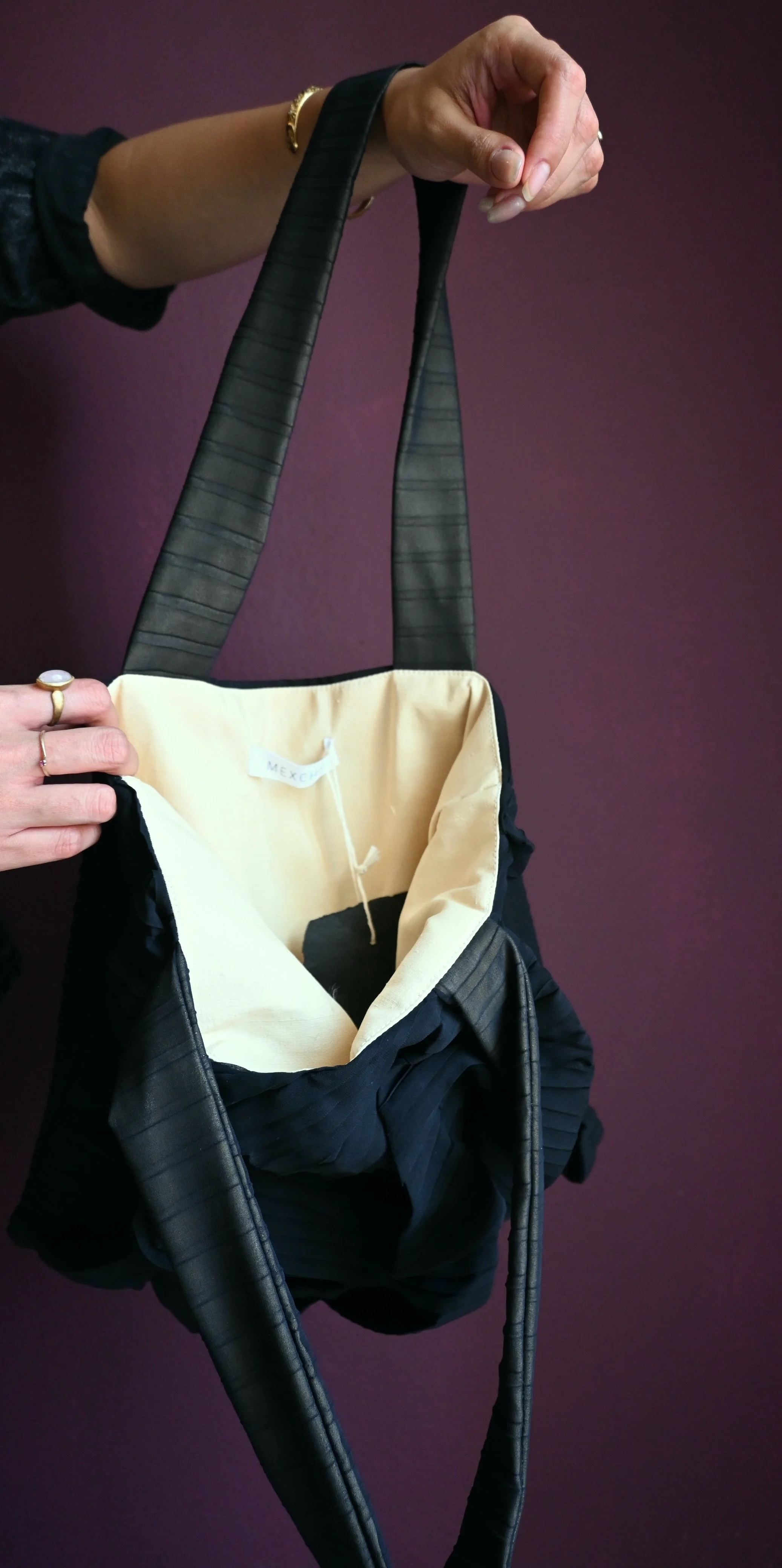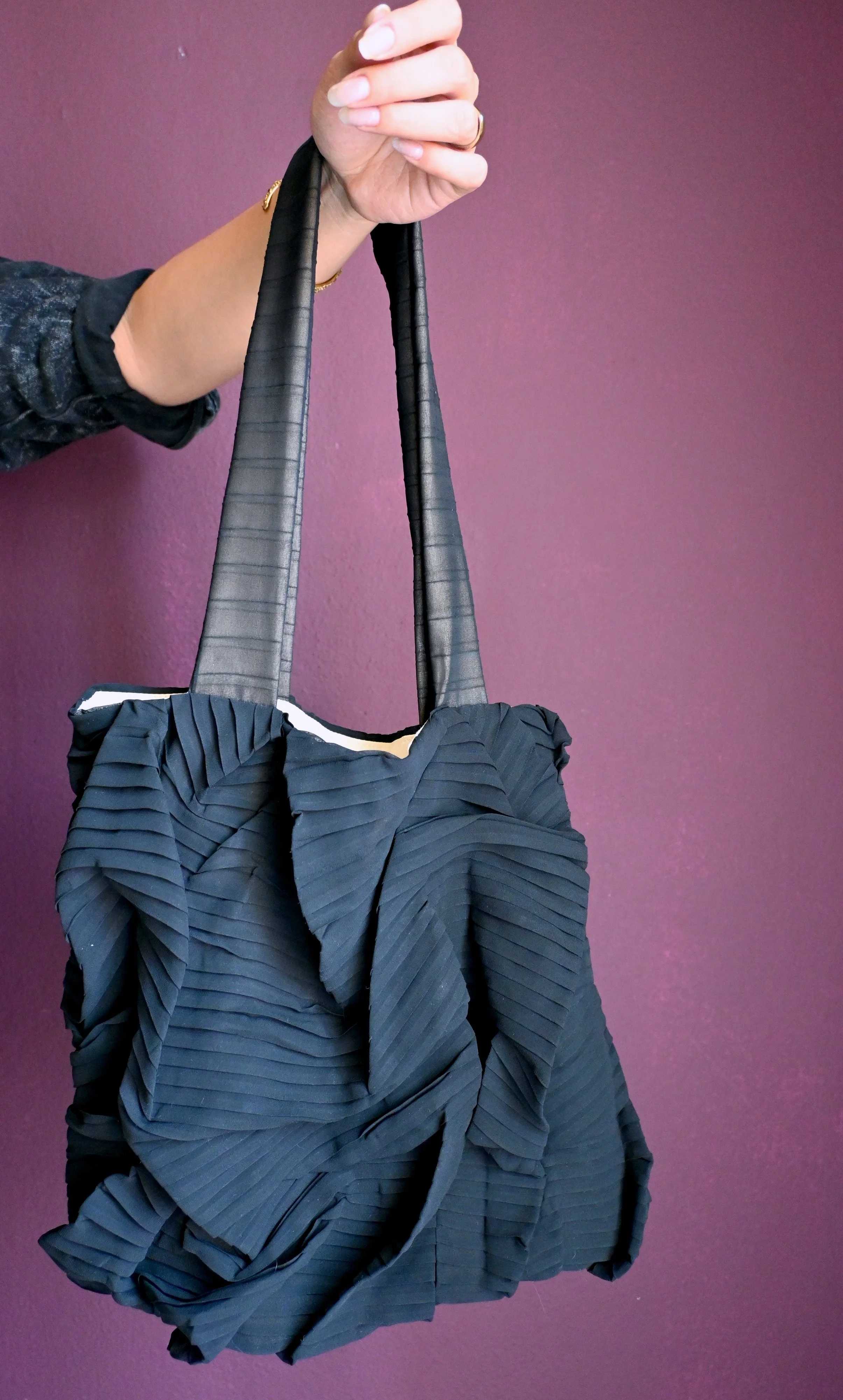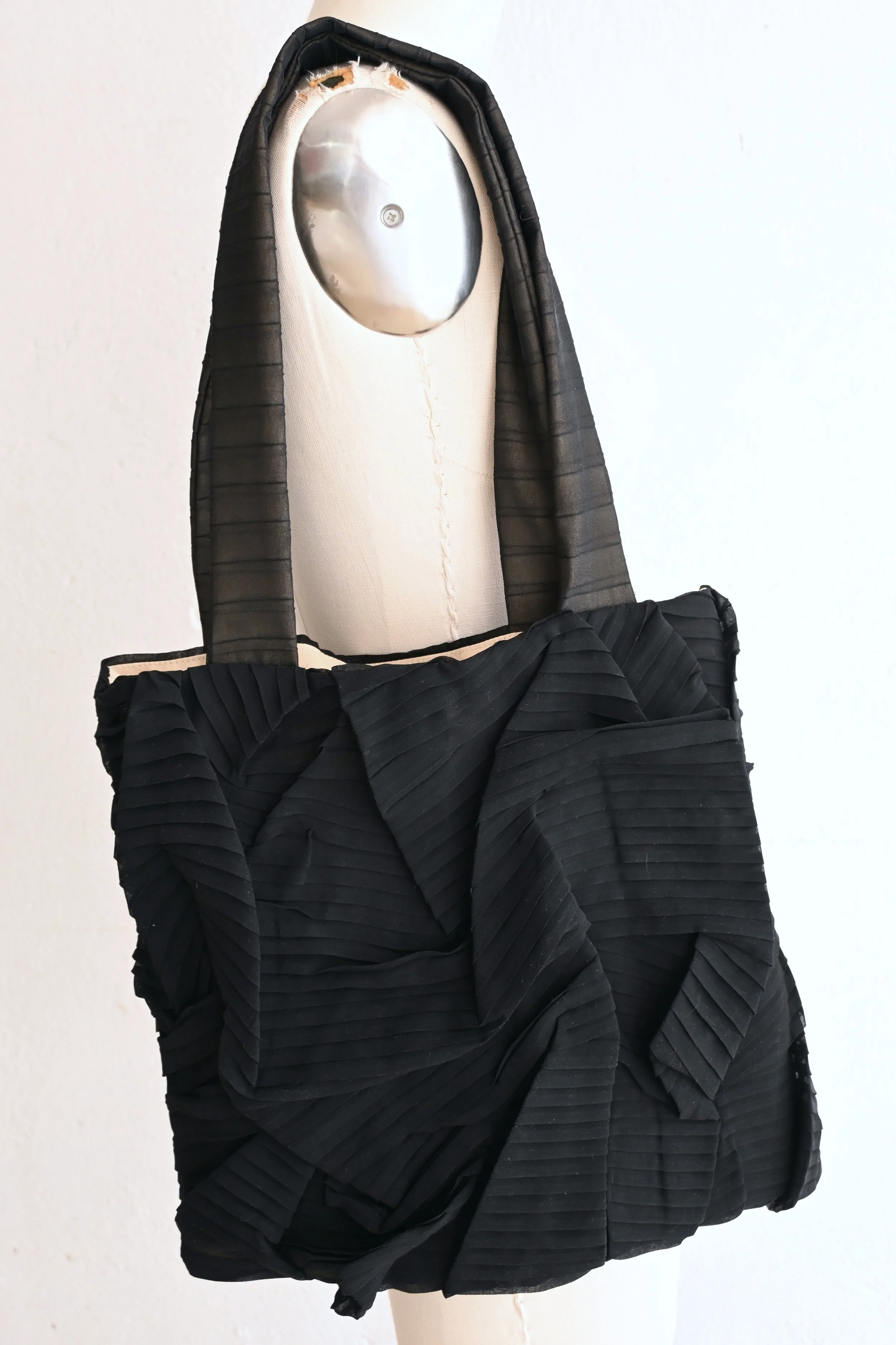 Small tote bag made with vintage Italian pleated viscose textile, which I formed into flowing sculptural shapes on the exterior front mini pocket. Lined with silk charmeuse and also straps.